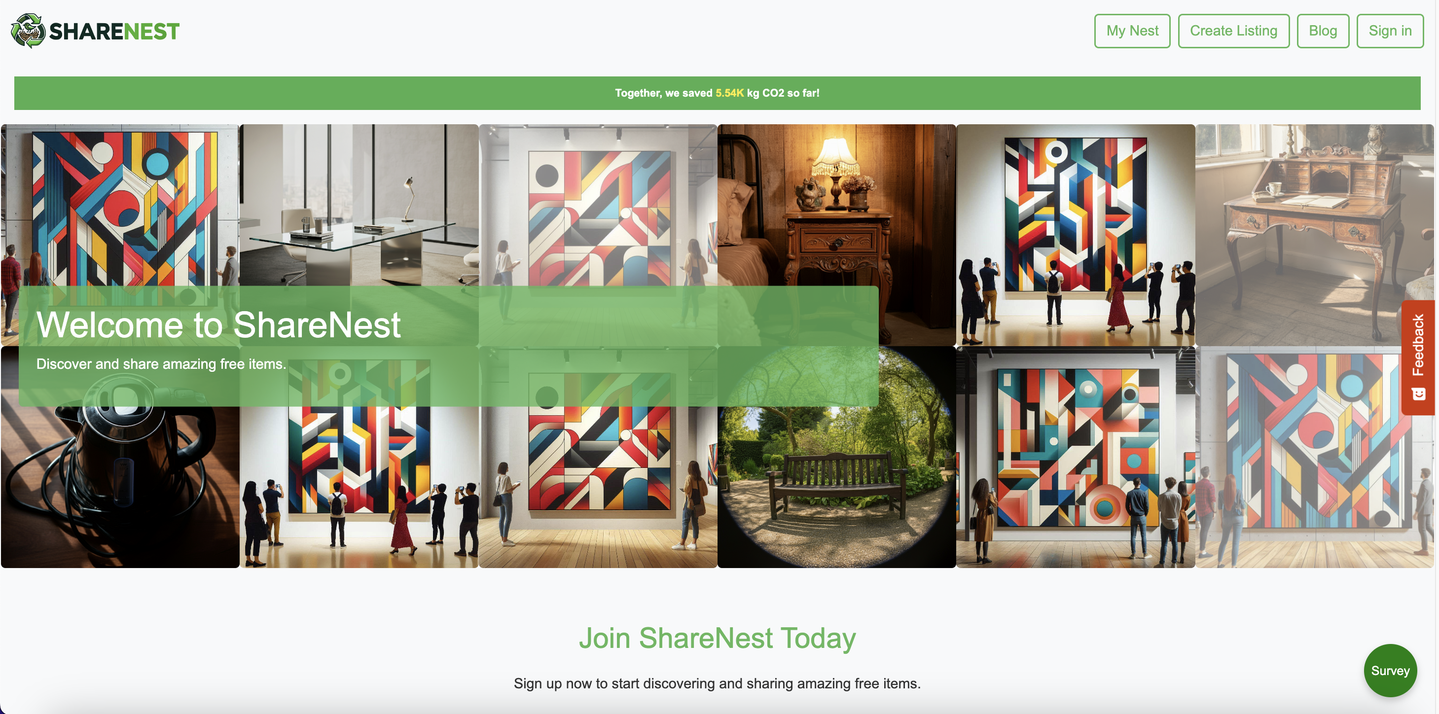 Sustainable platform for community sharing with user-friendly interface, location-based search, and CO2 savings counter.