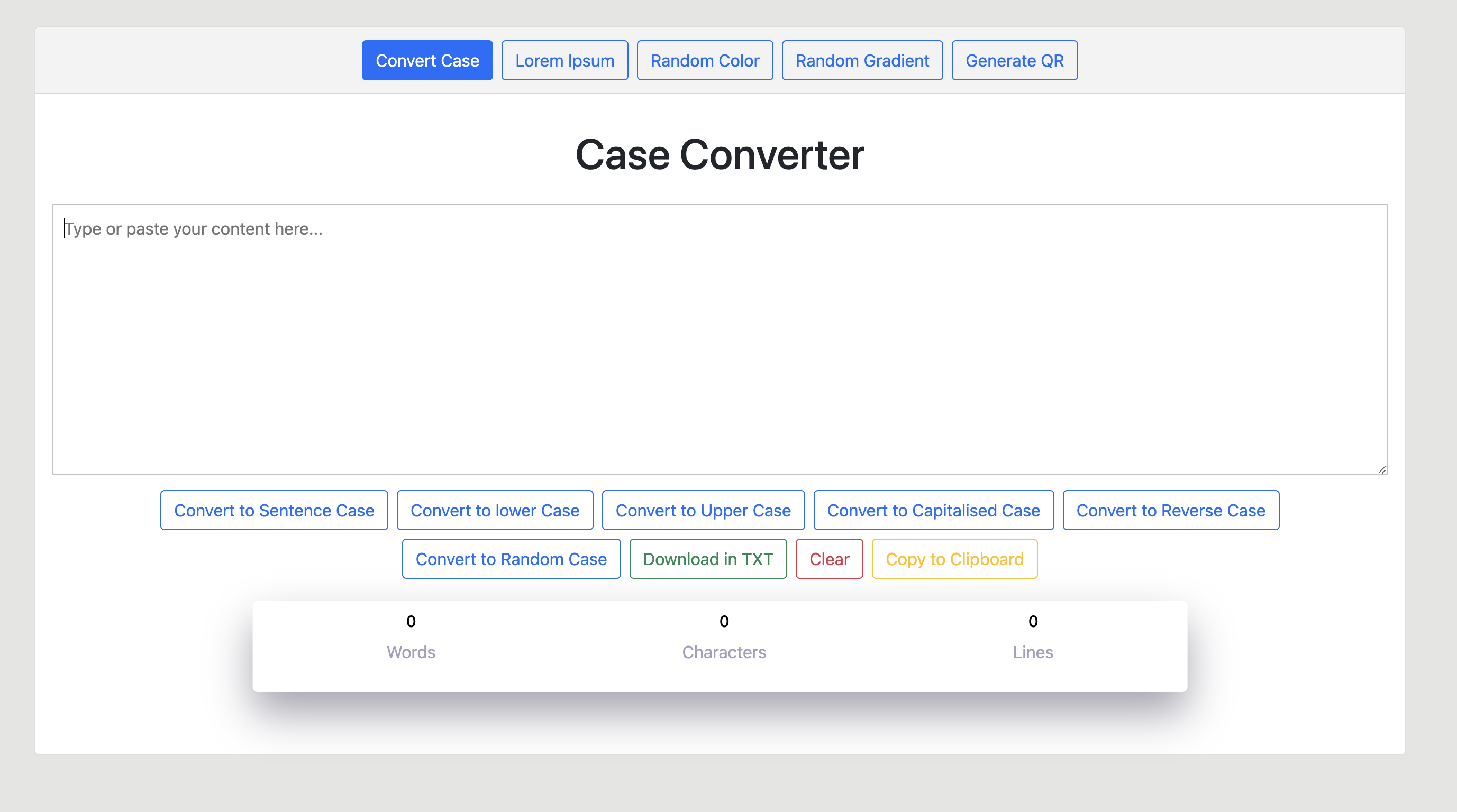 Text manipulation tool with case conversion, real-time counters, file download, and clipboard functionality.