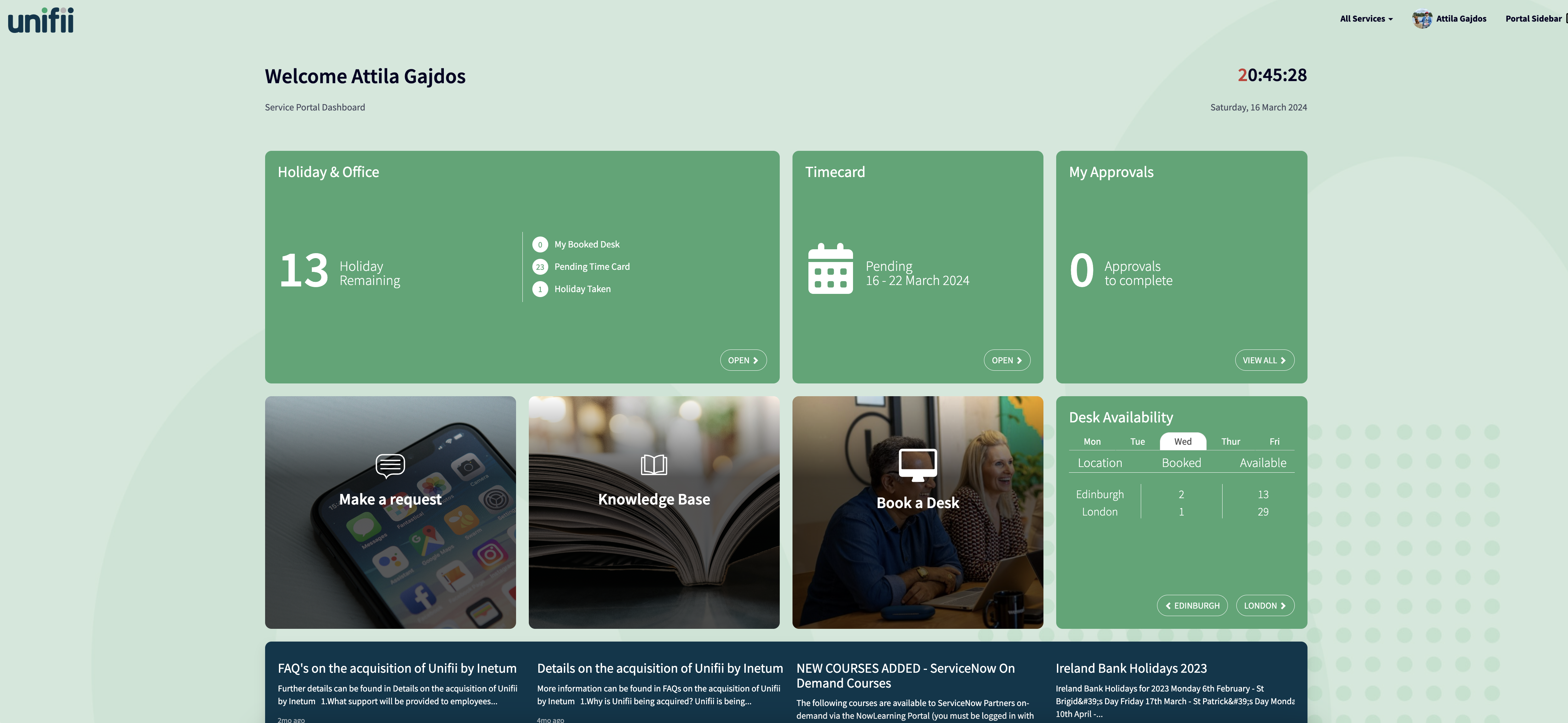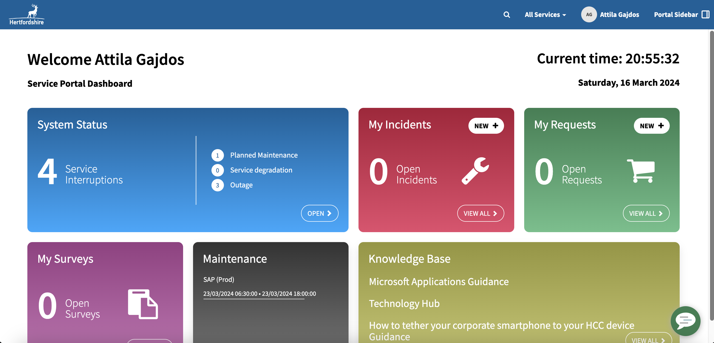 Bespoke ServiceNow service portal with custom widgets, strong brand identity, and user-tailored interface.